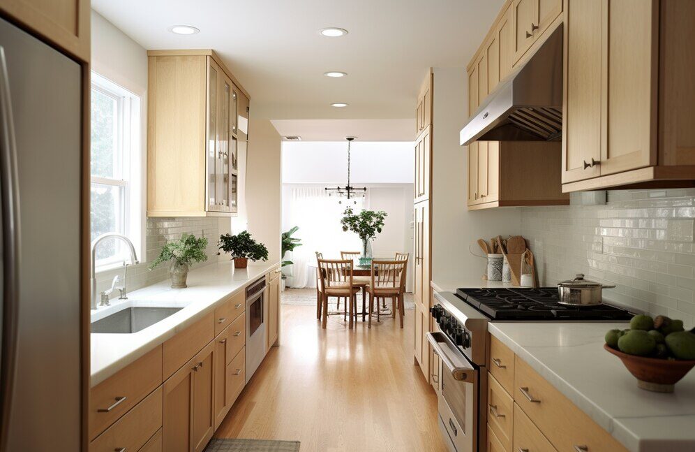 also known as a galley kitchen, features two parallel countertops with a walkway in between. It’s ideal for small to medium spaces, offering efficient workflow, ample counter space, and clear separation of cooking and cleaning zones. This layout is popular for its compact design and functional use of space.